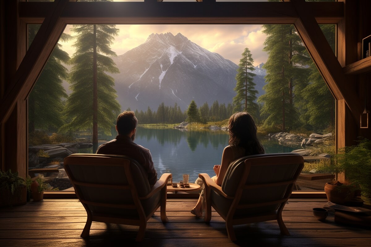 A beautifully designed A-frame cabin offer-ing modern luxury.